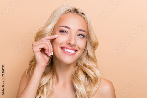 Portrait of attractive cheerful wavy-haired girl touching clear pore decorative cosmetic isolated over beige pastel color background
