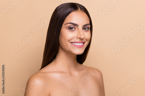 Portrait of attractive cheery perfect girl facial solution flawless smooth shine skin isolated over beige pastel color background