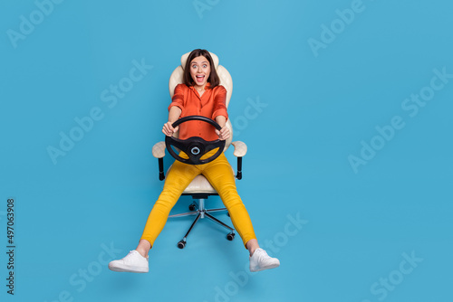 Portrait of attractive funny cheerful girl in armchair riding steering wheel having fun isolated over bright blue color background