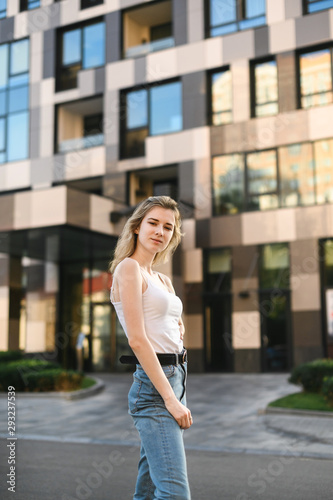 Portrait of attractive girl in casual clothes standing on the street against background of a modern building, looking into the camera, wearing jeans and a white T-shirt.Street vertical photo of girl