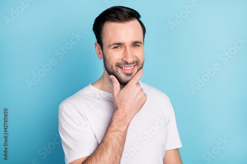 Portrait of attractive minded cheerful content well-groomed guy thinking touching chin isolated over blue bright pastel color background