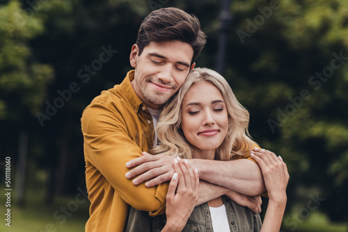 Portrait of attractive tender gentle sweet amorous affectionate couple cuddling enjoying rest romance outdoors