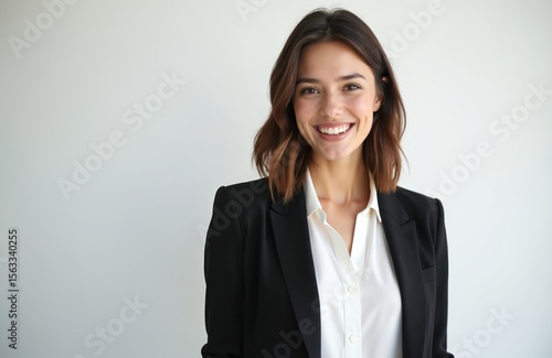 Portrait of attractive young businesswoman smiles looking at camera. Brunette pro woman wears black suit with white shirt isolated on white background. Smiling, confident lady. Business concept.
