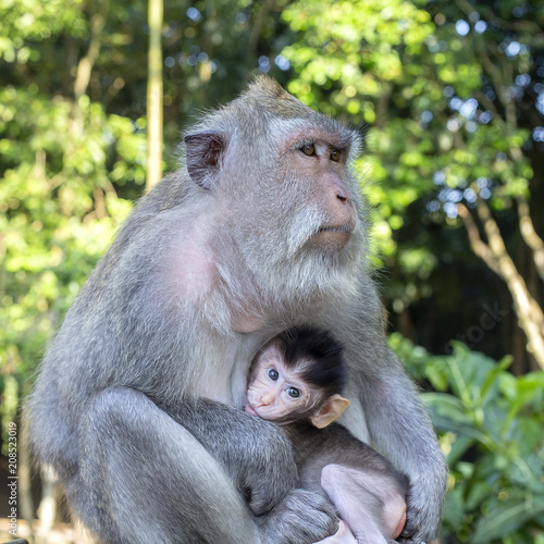 Portrait of baby monkey and mother at sacred monkey forest in Ubud, Bali, Indonesia. Close up