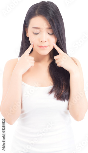 Portrait of beautiful asian woman makeup of cosmetic - girl hand touch cheek and smile on attractive face with skin healthcare concept.
