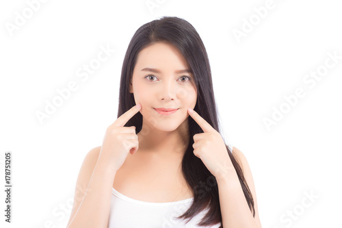 Portrait of beautiful asian woman makeup of cosmetic, girl hand touch cheek and smile attractive, face of beauty perfect with wellness isolated on white background with skin healthcare concept.