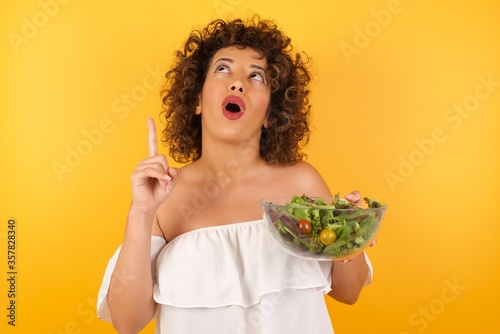 salad, vegetarian, arab, indian, latin america, yellow background, healthy lifestyle, nourishment, wow, expression, gesture, mature, up, woman, isolated, background, person, female, young, white, portrait, beautiful, beauty, people, lady, girl, hand, both, standing, adult, cheerful, point, copy space, looking, finger, caucasian, attractive, 1, smile, jean, model, happiness, showing, casual attire, finger, pretty, studio, gesticulate, business, brunette