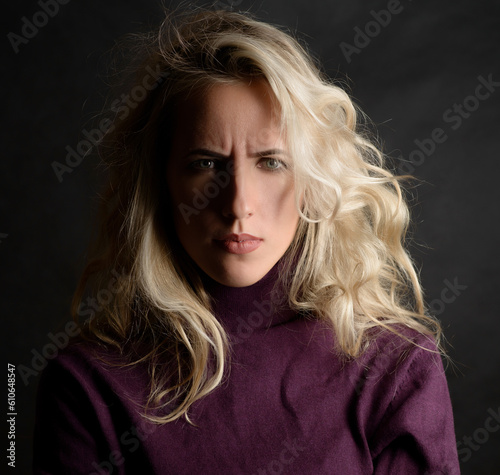Portrait of beautiful emotional woman with green eyes.