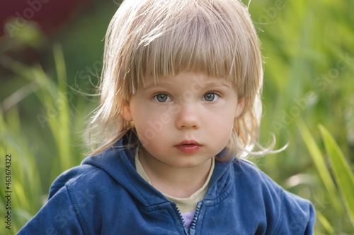 Portrait of beautiful Little girl plays at home backyard on sunny summer day.