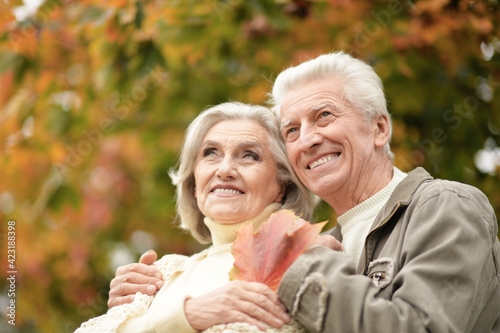 portrait of beautiful senior couple with leaves in the park
