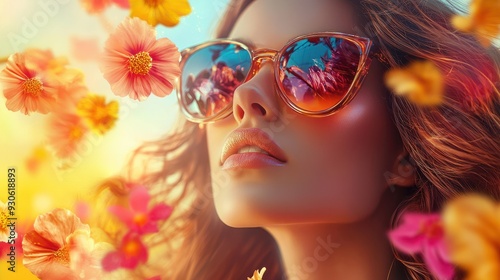 portrait of beautiful sensual woman in sunglasses among flying flowers. advert for perfume, cosmetic