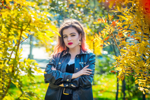 Portrait of beautiful stylish young woman with bright make-up, wearing black leather jacket, standing in autumn park near the tree with bright yellow foliage.