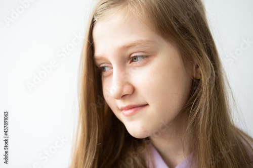 portrait of beautiful teenage girl with long hair in purple hoodie standing against white wall