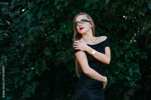 Portrait of beautiful woman in black dress, glasses and red lipstick