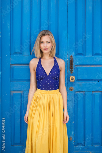 woman, dress, young, beautiful, fashion, beauty, portrait, model, hair, white, people, person, smile, isolated, cute, face, red, lady, blond, happy, door, smiling, 1, summer, glamour