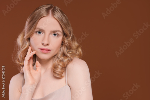 Portrait of beautiful woman with blonde hair on brown background. Space for text
