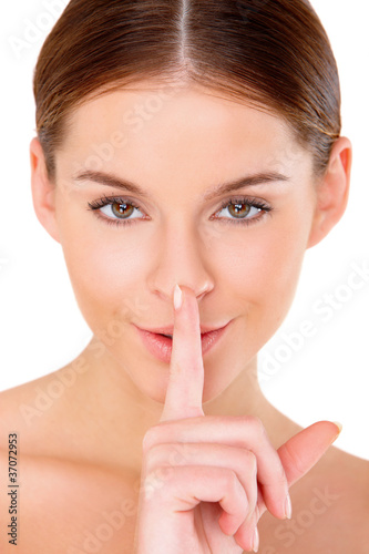 adult, attractive, background, beautiful, beauty, bright, brunette, care, caucasian, clean, closeup, cosmetic, cute, eye, face, fashion, female, fresh, girl, glamour, hair, happy, health, healthy, isolated, lip, looking, make-up, model, natural, 1, people, person, portrait, pretty, sensuality, sexy, skin, skincare, smile, spa, studio, white, woman, young, quiet, gesture, finger