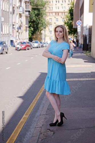 Portrait of beautiful young woman with blond hair and long eyelashes, summer outdoors