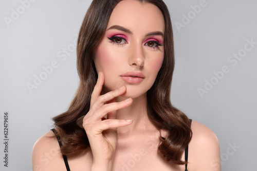 Portrait of beautiful young woman with makeup and gorgeous hair styling on light grey background