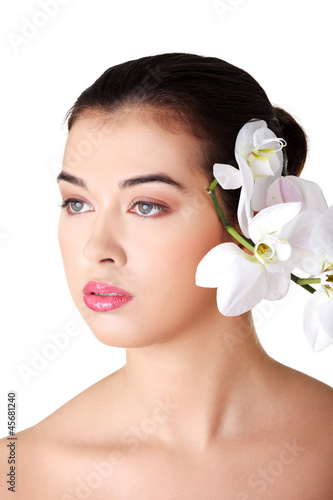 adult, attractive, background, beautiful, beauty, care, caucasian, clean, clear, closed, closeup, complexion, copy, cosmetic, eye, face, female, femininity, flower, fresh, freshness, girl, health, healthy, isolated, natural, 1, orchid, honed, portrait, sensual, sensuality, skin, skincare, spa, space, studio, treatment, white, woman, young