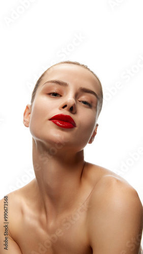 Portrait of beautiful young woman with perfect, smooth skin, red lips, posing isolated on white studio background. Concept of natural female beauty, skin care, cosmetics and cosmetology