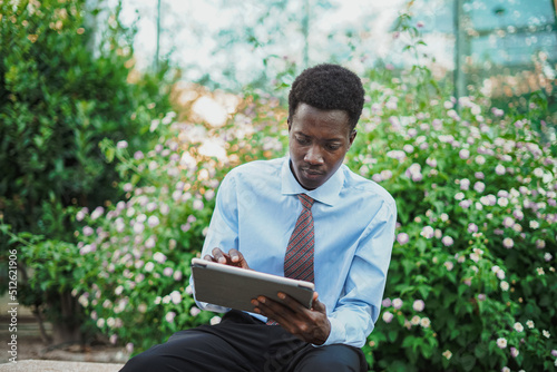 Portrait of black businessman using a tablet computer while he is sitting on a bench