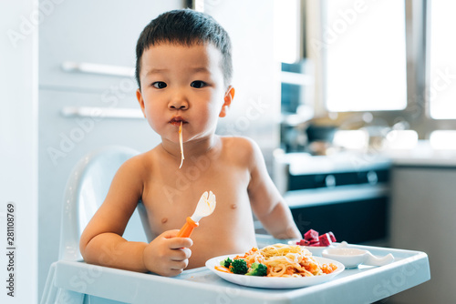 boy, children, preschool, chinese, asian, eat, to sit, portrait, food, vegetable, spaghetti, pasta, plate, fork, high chair, home, lifestyle, childhood, innocence, front, waist up, shirtless, topless, indoor, day, alone, 1, people, beijing, china