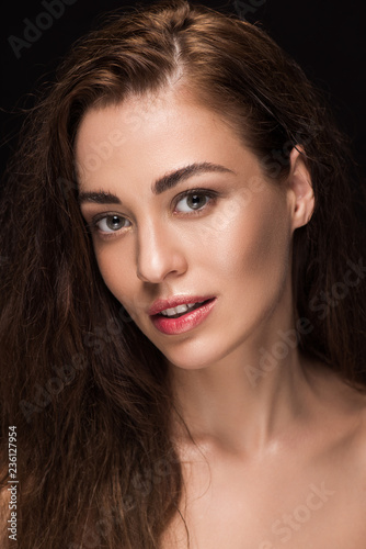 portrait, brunette, tender, girl, looking, camera, isolated, black, woman, beauty, beautiful, hair, model, face, young, fashion, make-up, glamour, eye, lip, skin, closeup, people, long, coiffure, studio, 1, lady, cute, style