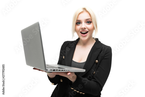 portrait of buisness blonde in black costume possing with laptop on background