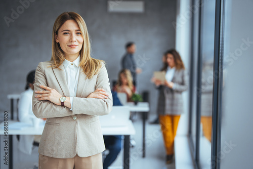 Portrait of businesswoman with a file standing in meeting room with colleagues disucssing in background. Waist up portrait modern business woman in the office with copy space