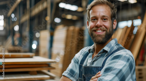Portrait of carpenter handsome man smiling at factory