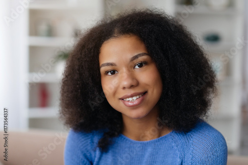 Portrait of cheerful pretty young black woman posing at home, sitting on couch and smiling at camera, free space. Millennials, women, females lifestyle concept. High quality photo