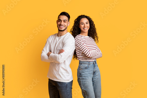 Portrait Of Cheerful Young Middle Eastern Man And Woman Posing Over Yellow Background, Happy Millennial Arab Male And Female Standing With Folded Arms And Smiling At Camera, Copy Space
