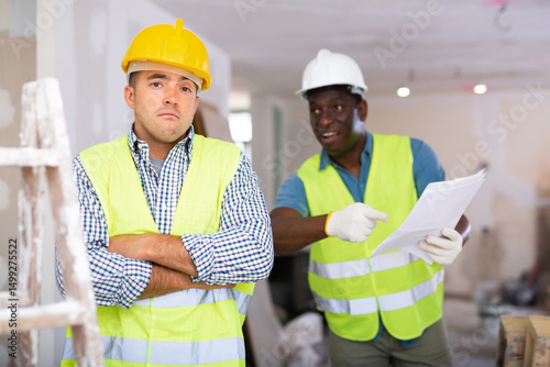 Portrait of confused european man builder standing in construction site in apartment while his foreman, african-american man, showing project documentation and shouting in background.