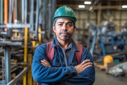 Portrait of construction worker in uniform is in the factory. Generative AI