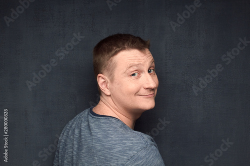 man, happy, look, back, glance, portrait, smile, face, kind, male, guy, funny, glad, romantic, white, background, person, positive, joyful, satisfied, cheerful, charming, friendly, middle, emotional, peaceful, contented, adult, closeup, caucasian, european, white-skinned, t-shirt, grey, fair-haired, studio, tenderness, carefree, welcome, sympathy, cute, looking, relaxed, pleasant, happiness, friends, flirting, love, like, naive