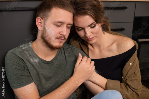 Portrait of couple in love hugging and spending time together at home sitting on the floor