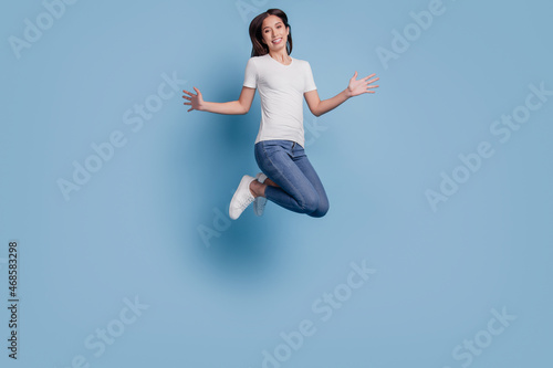 Portrait of crazy carefree lady jump have fun enjoy weekend on blue background