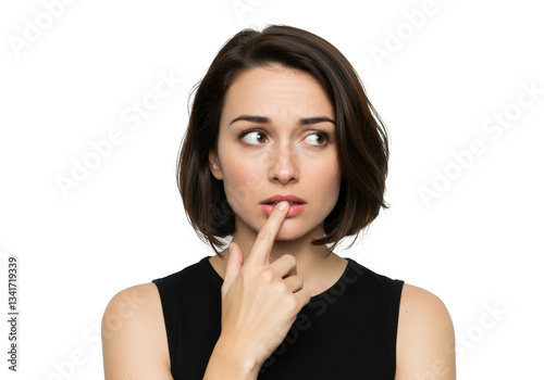 woman, silence, finger, beauty, secret, quiet, lip, mouth, people, silent, face, person, hand, gesture, signs, expression, shh, thinking, hush, brunette, model, 1, looking, gesticulate, lady