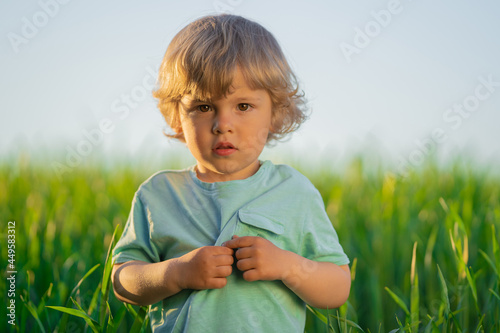 Portrait of curly kid standing in fresh green wheat field. Lovely toddler boy explores plants, nature in spring. Childhood, future, agriculture, ecology concept