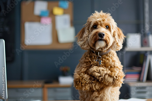 Portrait of cute dog with crossed arms in office.
