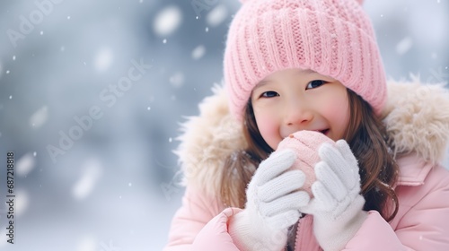Portrait of cute little girl in beautiful warm outfit on winter background