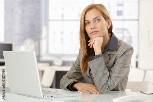 portrait, businesswoman, determined, desk, office, sitting, looking, camera, computer, people, suit, working, professional, business, laptop, copy space, lifestyle, caucasian, woman, smiling, job, face, career, satisfied, notebook, smart, room, 1, smile, beautiful, shirt, casual attire, single, blond, determination, photo, beauty, bright, table, alone, young, pretty, employment, 20s, american, european, day, grey, good, mood