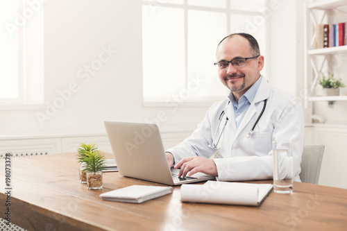 care, clinic, doctor, equipment, health, health care, hospital, man, medicals, medicine, people, smart, stethoscope, typing, uniform, assistant, cheerful, consultation, make well, diagnose, disease, friendly, indoor, happy, intern, job, laptop, male, paediatrician, apothecary, physician, practitioner, profession, smile, specialist, surgery, treatment, white, work, technology, online, office, patient, health care, healer, copy space, doc, goggles