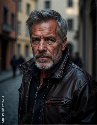 Portrait of elderly man wearing leather jacket while standing in urban setting with narrow streets and blurred background creating sense of depth