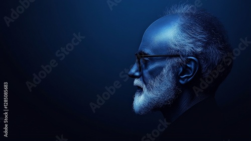 elderly, man, goggles, profile, blue, portrait, adult, mature, serious, thoughtful, expression, beard, hair, light, shadow, face, calm, solitude, personality, age, wisdom, depth, clarity, appearance, skin, emotion, character, human, individuality, creativity, artistic, modern, style, serene, contemplation, beauty, elegance, society, culture, isolation, background, coiffure, facial hair, feature, peaceful