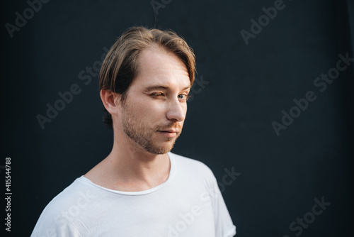 man, portrait, european, caucasian, blue eye, white, shirt, dark, black, wall, background, outdoors, studio, summer, casual attire, 30, 35, look up, emotion, emotional, joy, enjoy, happiness, wink, flirt