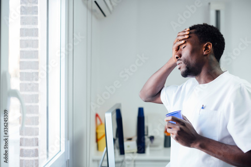 one person, young men, beard, dentistry, short hair, standing, occupation, copy space, portrait, indoor, health care, black hair, medical practice, dentist, doctor, health, spain, window, stress, serious, holding, ill, fever, responsibility, exhaustion, eyes closed, half face, dental assistant, frustration, cup, people, adult, man, young adult, job, dark hair, clinic, disease, emotional