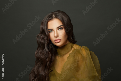 Portrait of fashionable woman with makeup and long curly hair on black background portrait