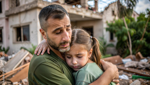 Portrait of father and daughter hugging each other while standing in front of destroyed house